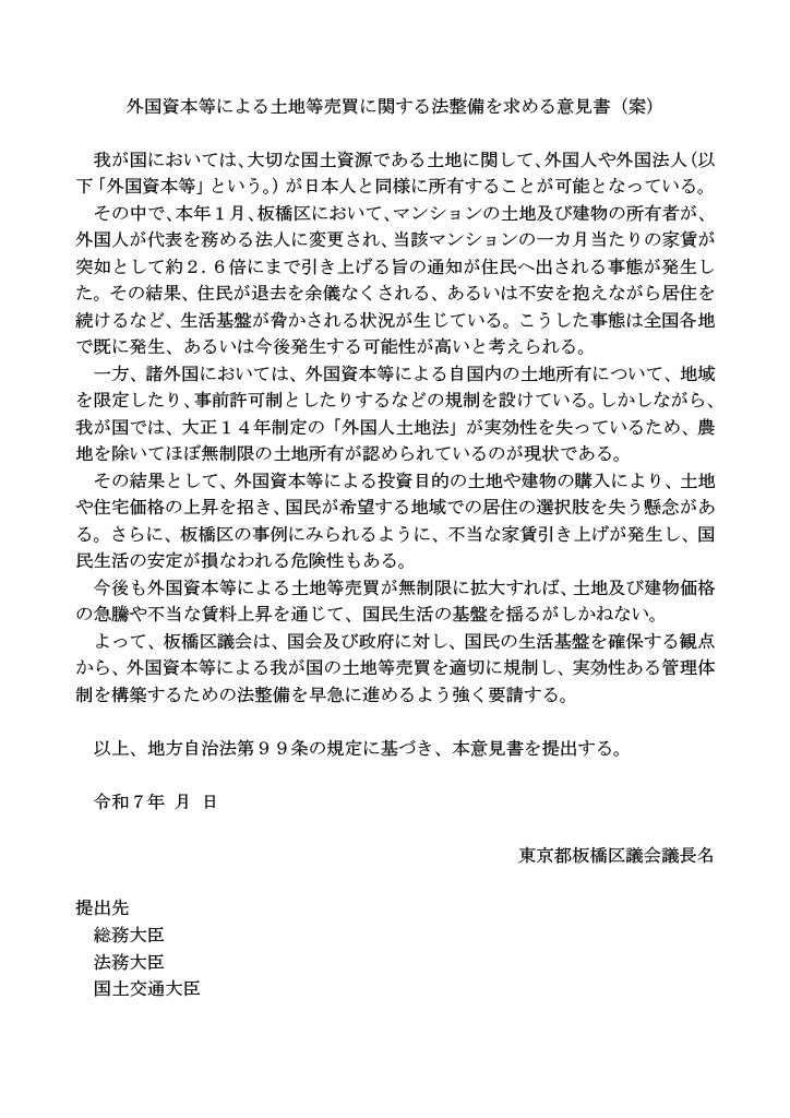 本年1月、板橋区においてマンションの土地及び建物の所有者が、外国人が代表を務める法人に変更され、当該マンションの一カ月当たりの家賃が突如として約2.6倍にまで引き上げる旨の通知が住民へ出される事態が発生しました。その結果、住民が退去を余儀なくされる、あるいは不安を抱えながら居住を続けるなど、生活基盤が脅かされる状況が生じています。こうした事態は全国各地で既に発生、あるいは今後発生する可能性が高いと考えられるため、今定例会にて、国民の生活基盤確保の観点から、国への「外国資本等による土地等売買に関する法整備を求める意見書」を私の発起・起案で自民党から提案しました。