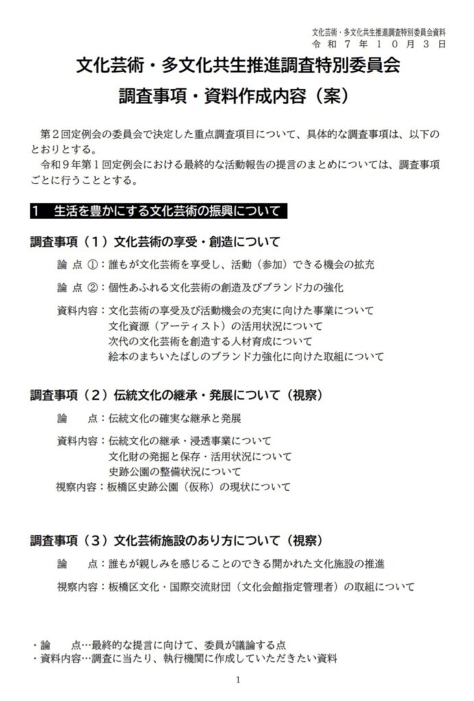 文化芸術・多文化共生推進調査特別委員会😃 本日は「文化芸術の享受・創造について」の調査と2つの論点での意見出し。 昨年の区の文化芸術などに関する意識調査を基に、区の文化芸術施策の発信強化、教育現場でのふるさと文化伝承事業の拡充、文化芸術を創造する人材育成での継続的な支援などを意見。