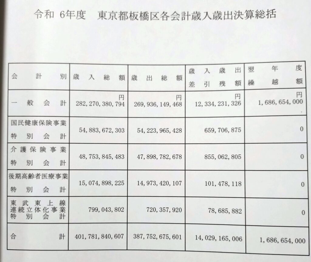 区から提示された令和6年度の板橋区決算に関する説明会。