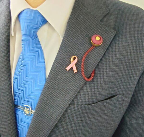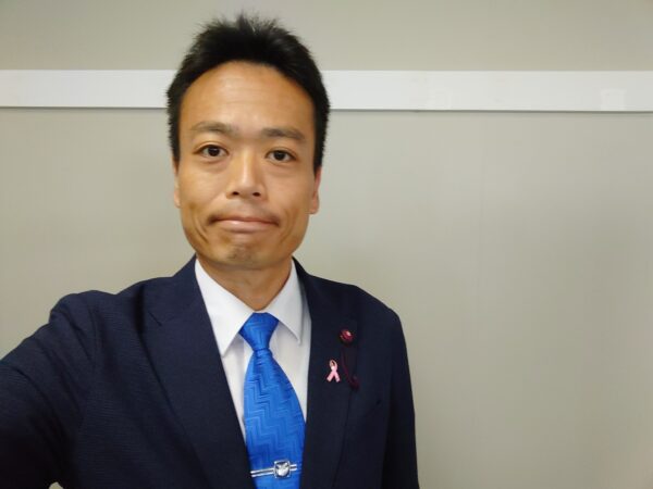 ひはらみちこ議員から乳房を意識する生活習慣である「ブレスト・アウェアネス」の普及と啓発のためのピンクリボンをいただきました😃