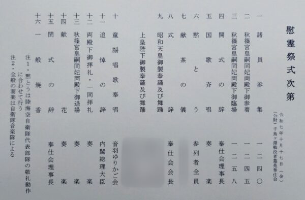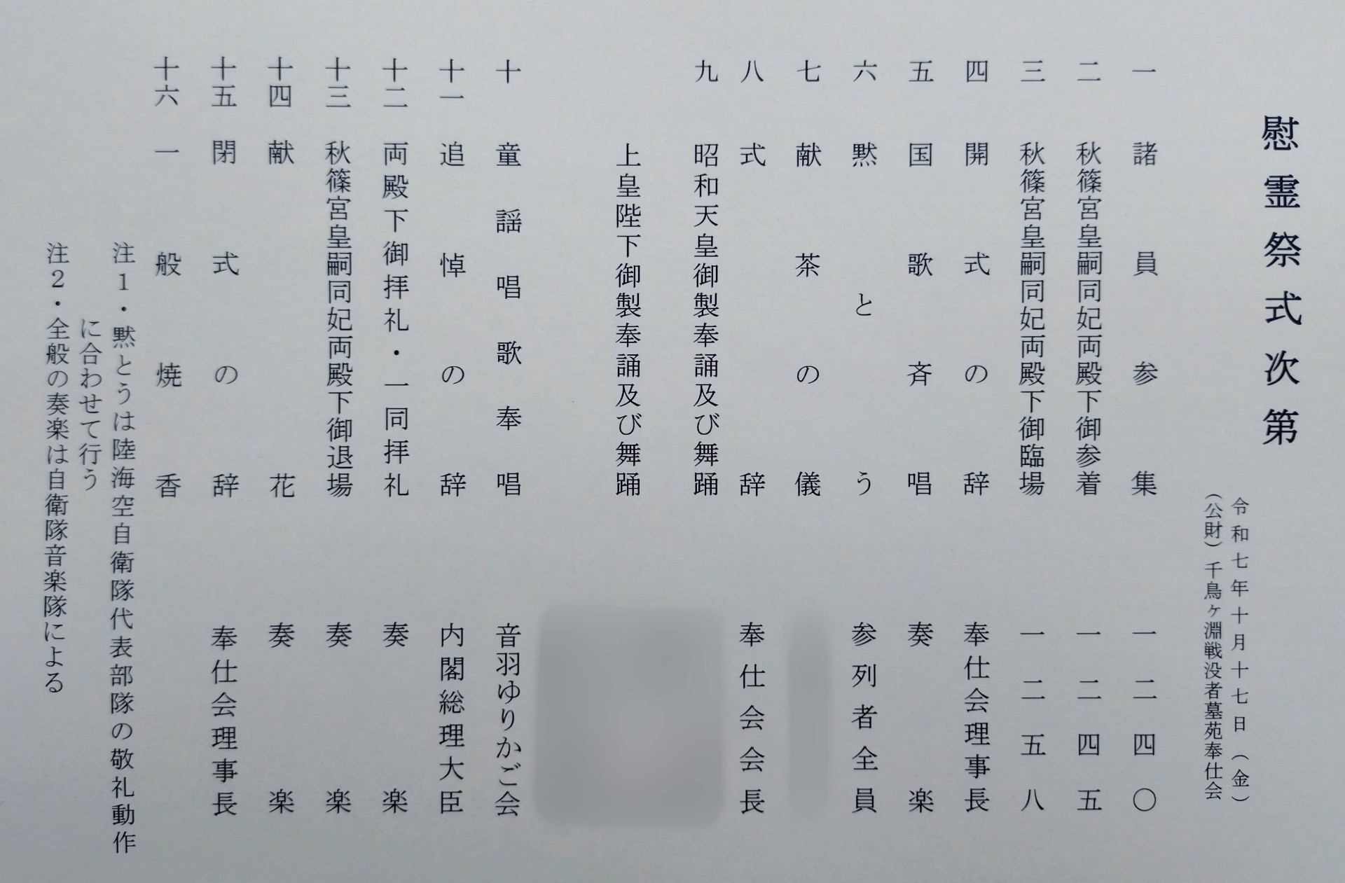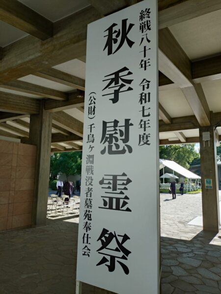 隊友会会員として、千鳥ヶ淵(ちどりがふち)戦没者墓苑での秋季慰霊祭を支援。 今年は戦後80年の節目で、昨年よりも多い433人の方々がご参列。 私も哀悼の誠を捧げました。 千鳥ヶ淵戦没者墓苑は、先の戦争で海外で亡くなられた戦没者のご遺骨を納めるため、国が建設した無名戦没者のお墓。 本年7月末現在、軍人、軍属、一般邦人の370,989柱のご遺骨を奉安。