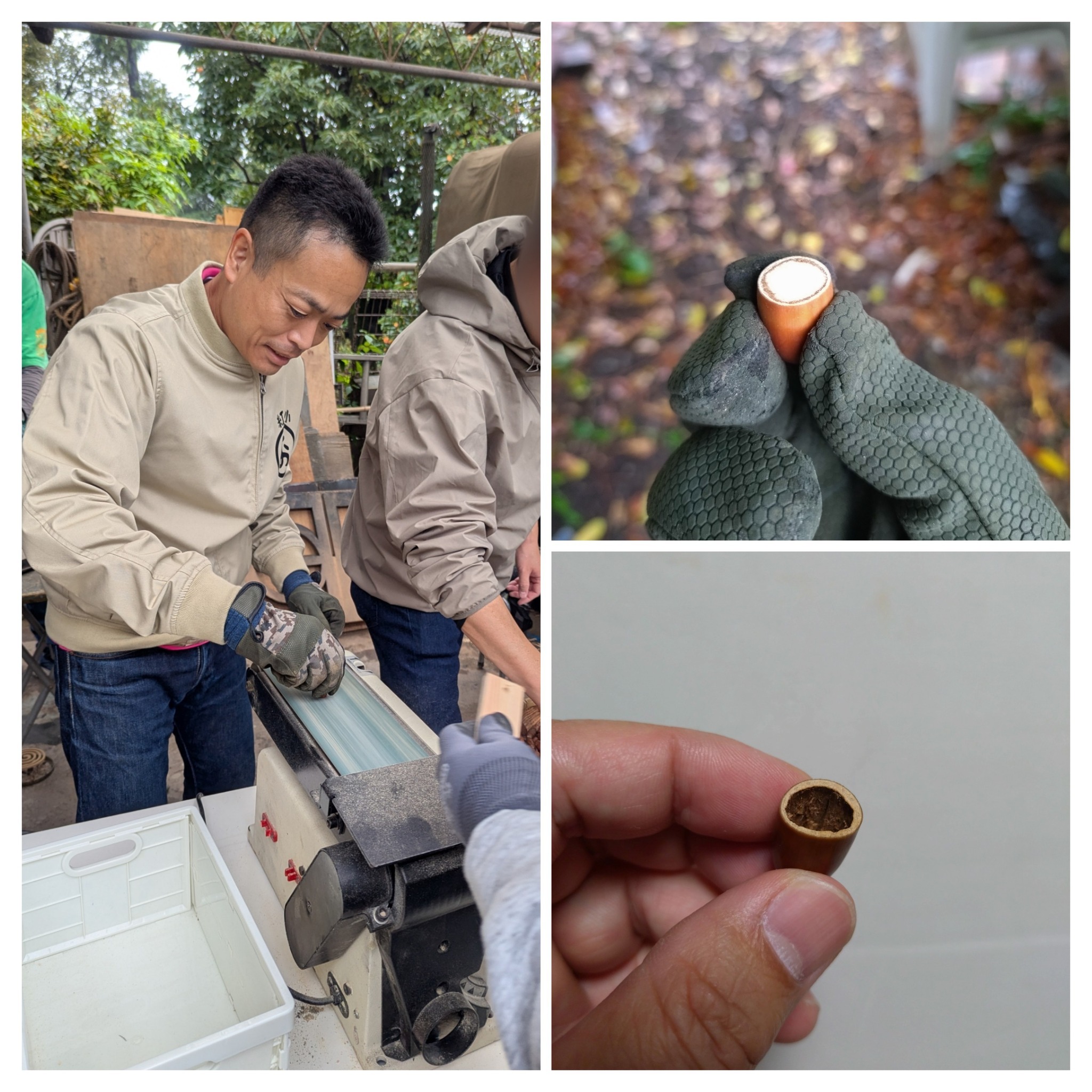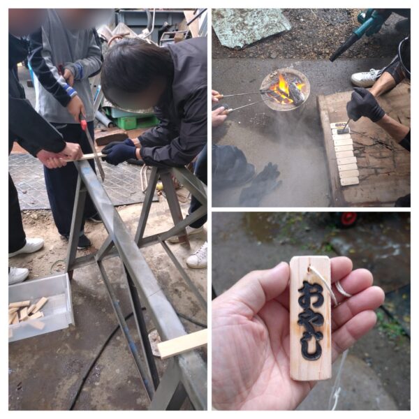 来場者には、削られたドングリの中身をくり抜いてドングリ笛を作成してもらい、上手く吹けたら「おやじ札」を進呈。