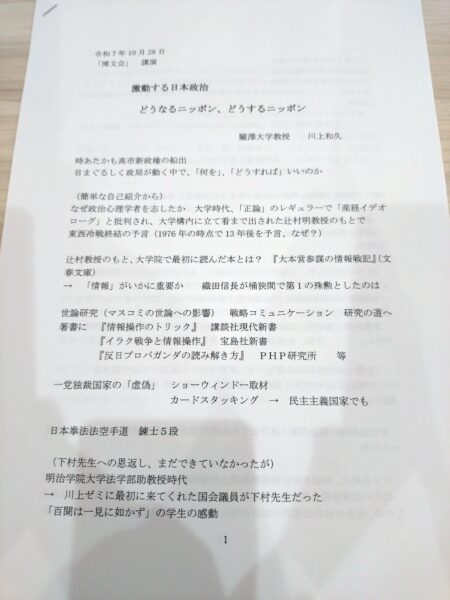 博文会政策勉強会😃 講師は麗澤大学教授の川上和久先生。「激動する日本政治 どうなるニッポン、どうするニッポン」がテーマ。 政治の場合の3-4-3の比率法則は、3(革新)-4(無党派)- 3(保守)で、憲法改正の際は、「4」の層を敵に回さずに説得するなど、丁寧なコミュニケーションが必要とのこと。