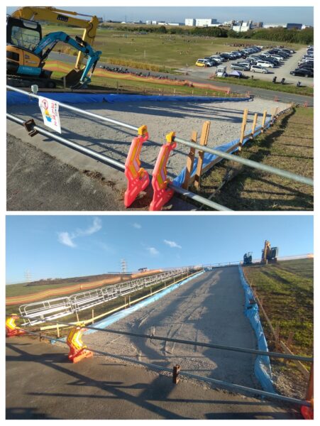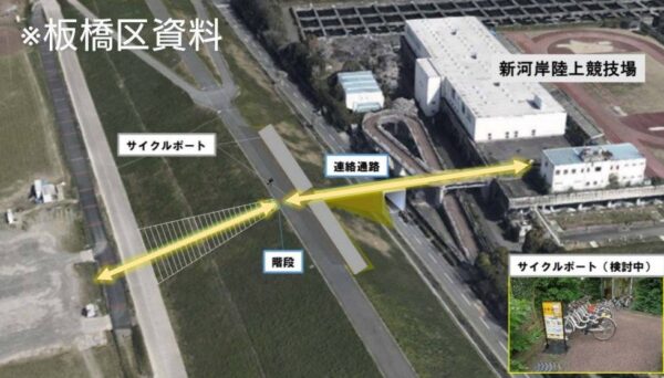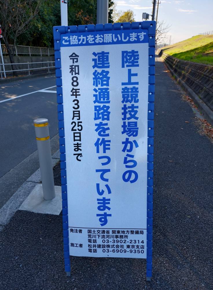 荒川の堤防下で行われている「板橋区かわまちづくり連絡橋工事」。 区立新河岸陸上競技場と荒川河川敷を連絡通路で結び、荒川氾濫時の避難経路の確保と、陸上競技場と河川敷を結ぶことで交流人口の増加を図るもの。 だいぶ工事が進んできました😃 事業期間は令和8年3月まで。