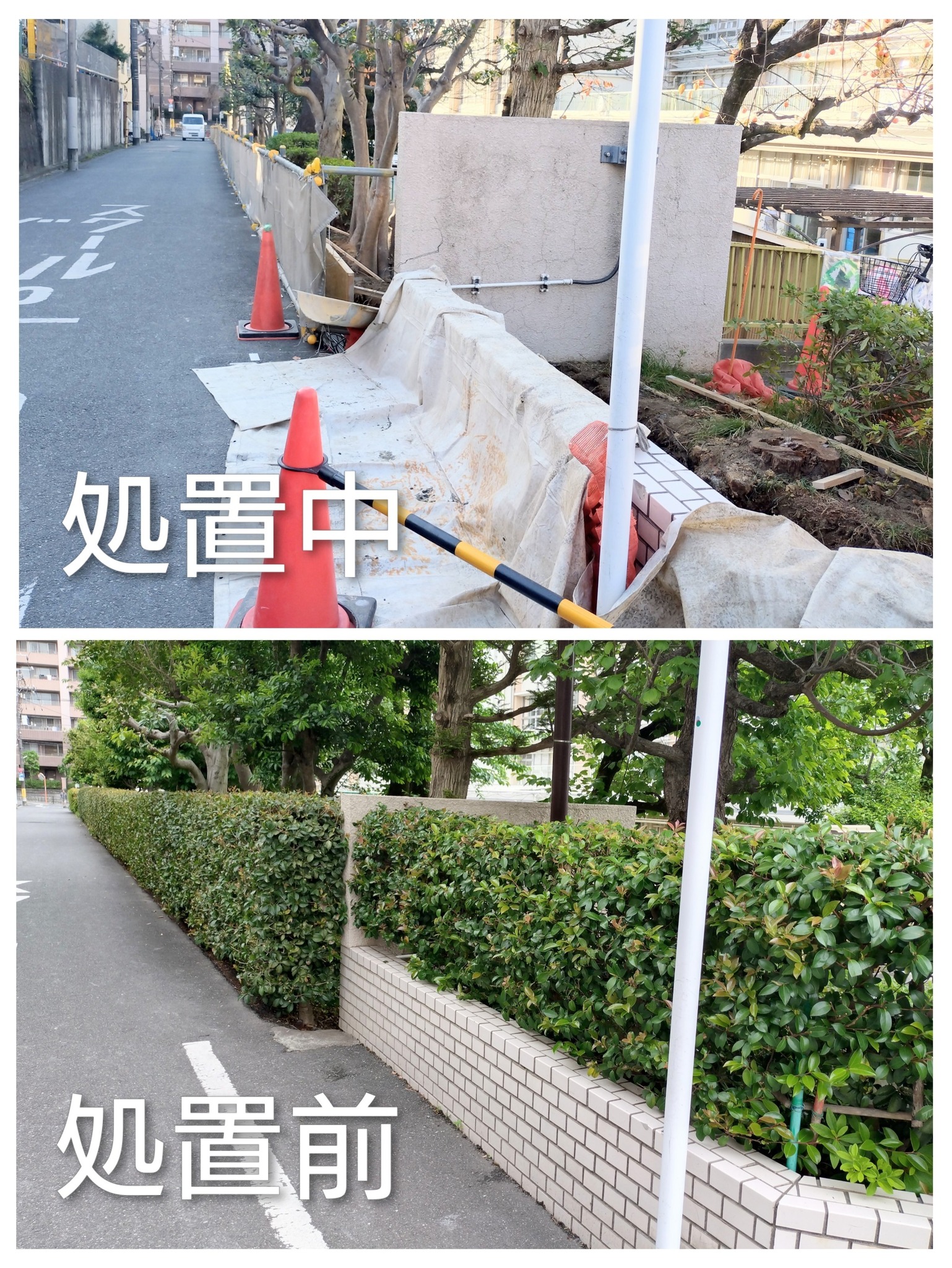 私から、生け垣をフェンスに換えるよう区に要望したところ、ご対応いただけることとなり、現在工事中🚧 生け垣に隙間もあったため、学校警備強化の一環でもあります。