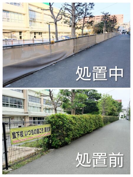 北野小学校の保護者の方々から、小学校の生け垣に毒針毛(どくしんもう)をもつチャドクガの幼虫が発生し、児童が危険とのご相談⚠️