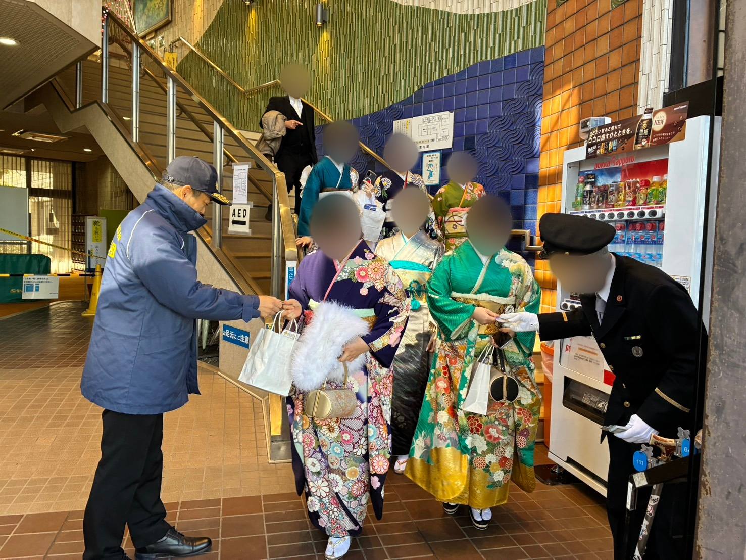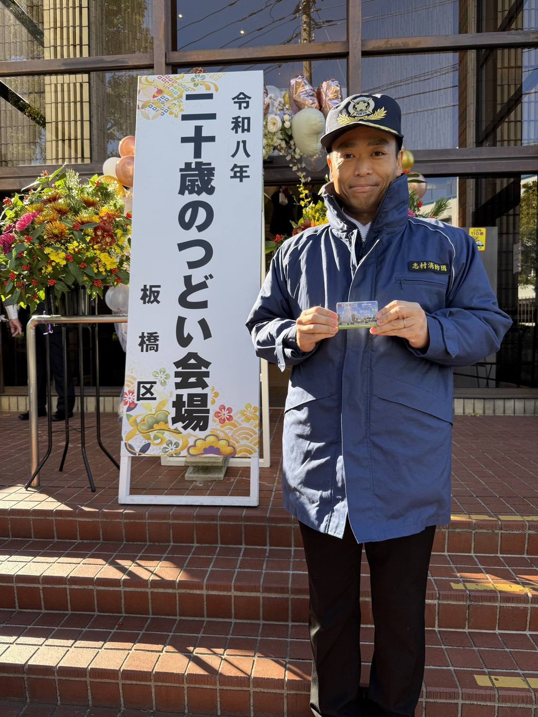 徳丸地区「二十歳のつどい」終了後、急ぎ消防団の服装で出席者の皆さんに消防団入団のご案内🚒 何名かの方から「消防団に入ります!」とのお返事が😃 災害が激甚化する中、消防団員は年々減少傾向にあり、地域防災力向上のためにも若年層の方々にも入団していただきたい。 よろしくお願いいたします😊