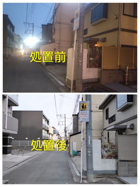 その看板が何かの衝撃で向きが変わり、国道から来る車から全く見えない状況であったため、区に依頼して向きを直していただきました。