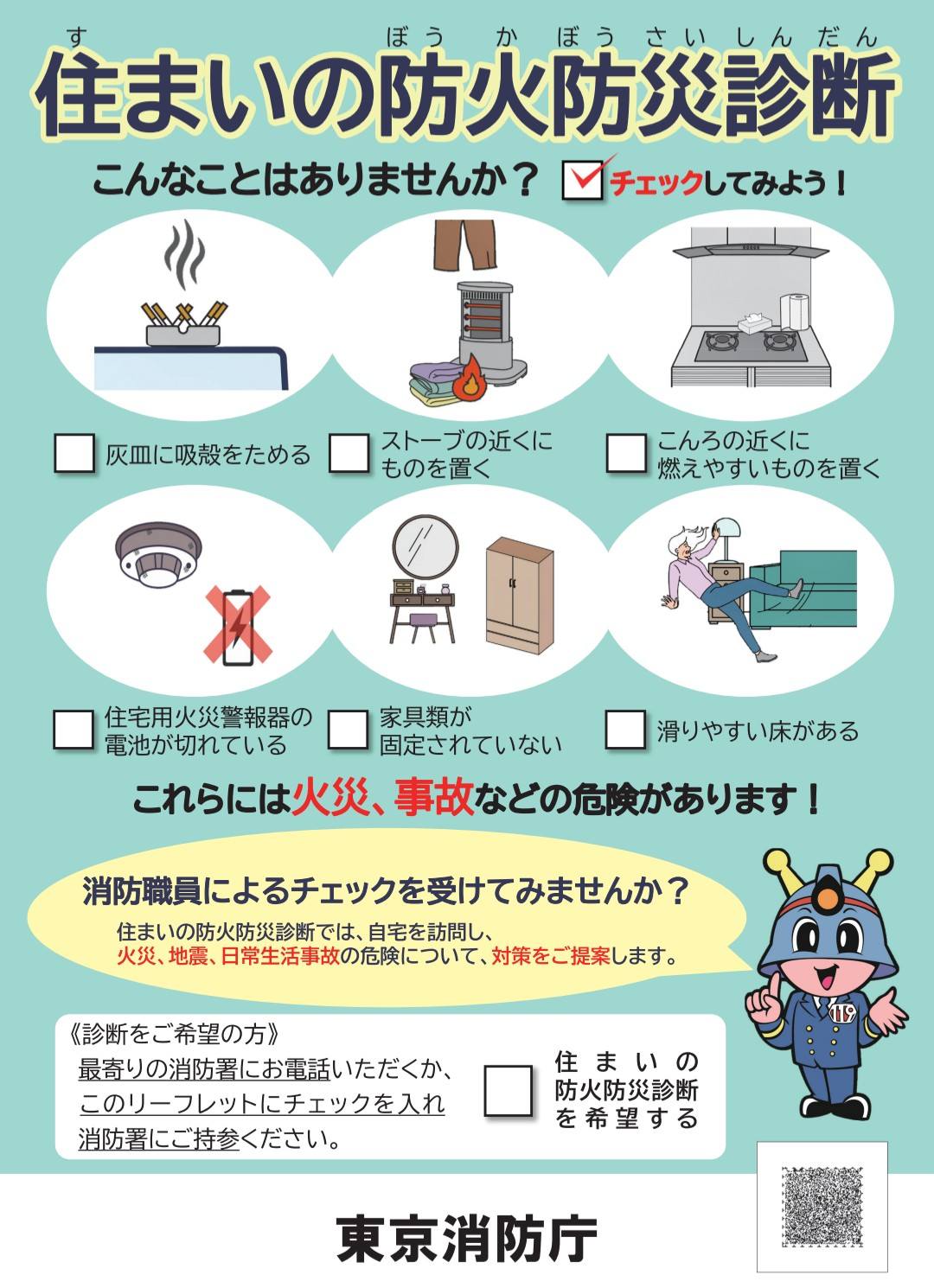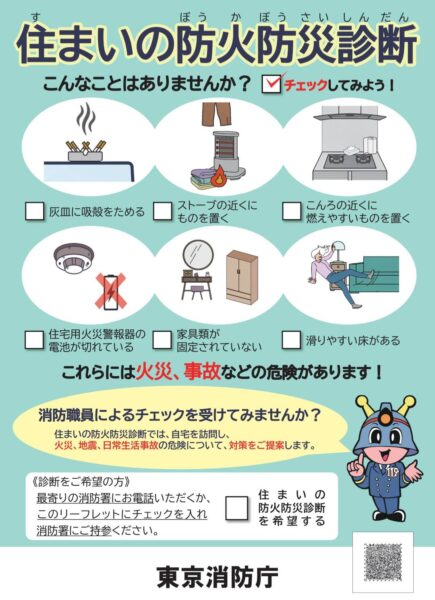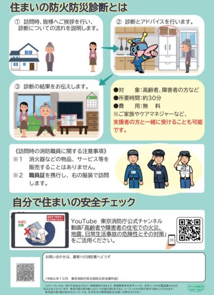 先日の支え合い会議徳丸スポットにてご要望をいただきました、東京消防庁が高齢者や身体が不自由な方などの要配慮者世帯を対象に行う「住まいの防火防災診断」をご案内。