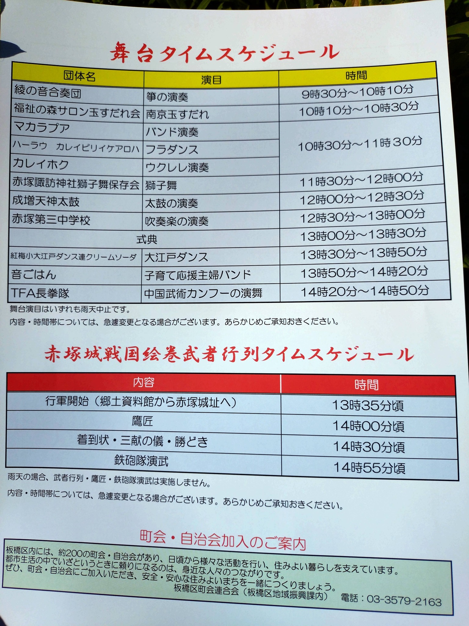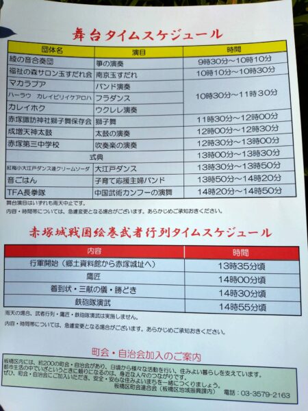 13:35頃から「赤塚城戦国絵巻武者行列」や「西洋流火術鉄砲隊保存会」さんによる鉄砲隊演武などもあります。