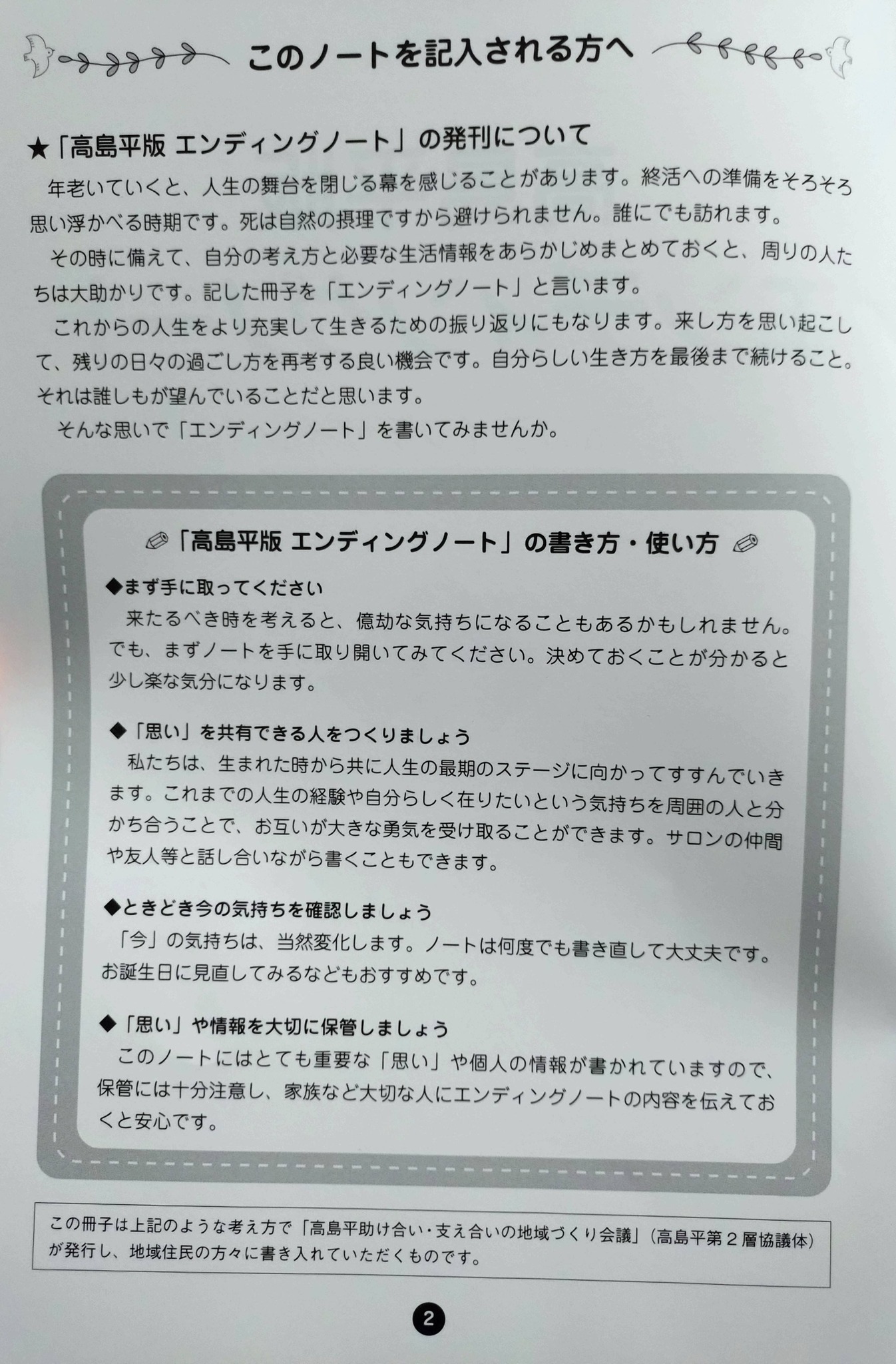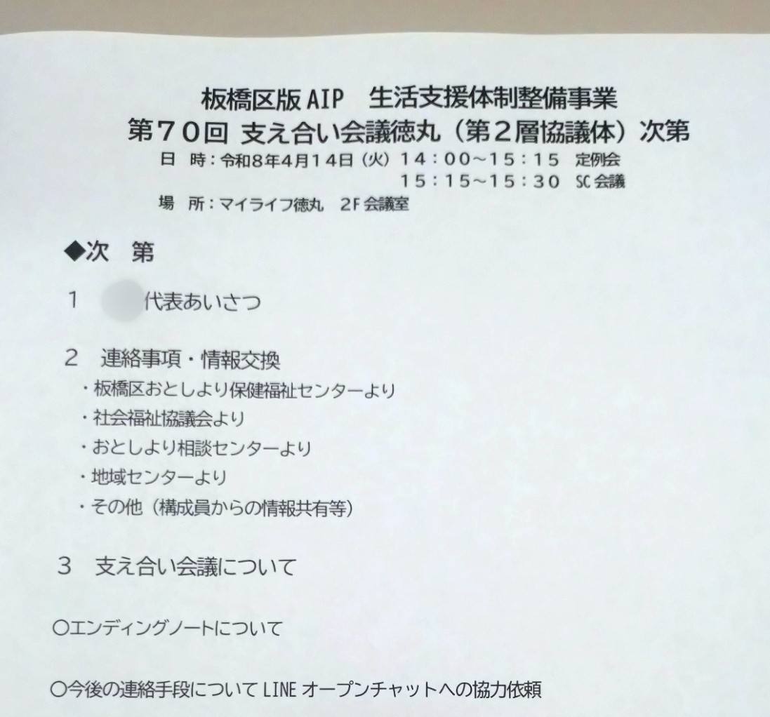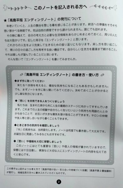 支え合い会議徳丸。 「支え合い会議高島平」の皆さんから「高島平版エンディングノート」のご説明。 3年前に作成され、16ページながら、記載しておくべき最低限の項目があり、無料で配布されているとのこと。 病院から院内サロンでの説明依頼があるなど、病院からもよい反応があるそう。 ある病院のサロンに置かれていた約1,000部は全て無くなったそうです。