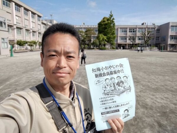 紅梅小学校おやじの会の勧誘活動😃 本日は、学校公開(授業参観)で保護者の皆さんが来校されるため、おやじの会の皆と「紅梅小おやじの会」への入会勧誘でビラ配り。 交代しながらそれぞれのお子さんの参観も。 紅梅小児童の保護者の皆さん、子どもたちや自分たちの楽しみのため、ご入会ください🙇